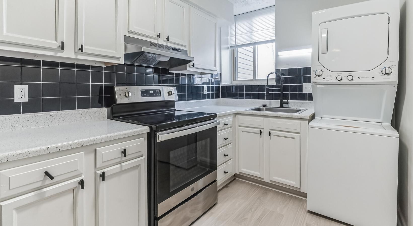 • stacked washer/dryer in kitchen with a window